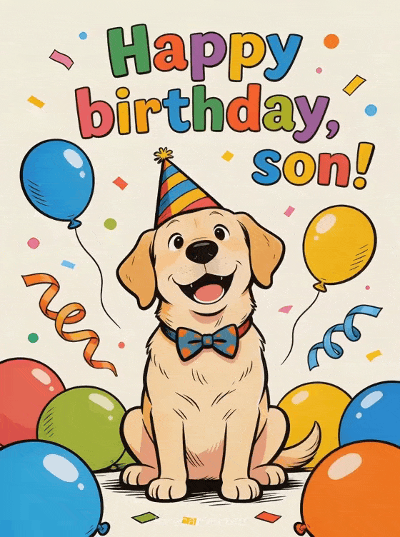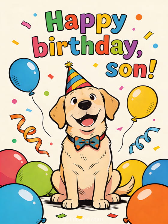 Make your son smile with a funny birthday card showing a playful labrador dog wearing a crooked party hat and bow tie, surrounded by balloons and streamers. Discover also a birthday text for my son, a happy birthday my son quote, or a birthday for a son.