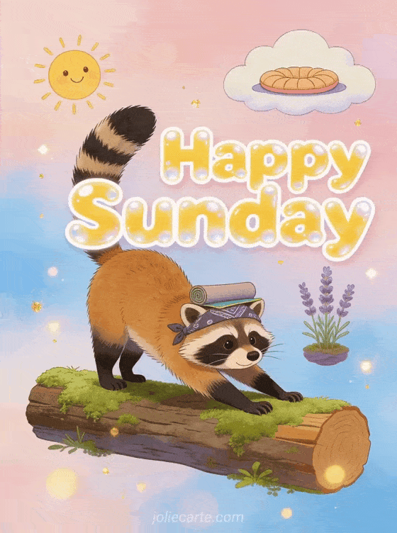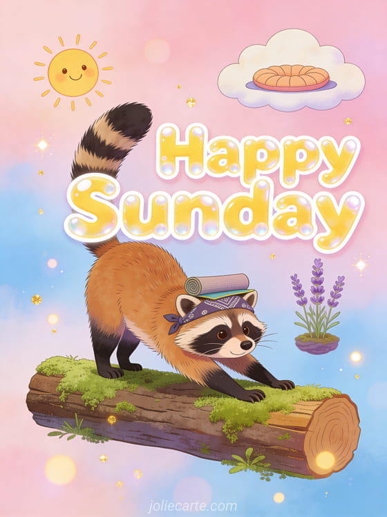 Send a funny happy Sunday greeting with bouncy bubble letters and a silly raccoon doing yoga poses on a log in a ridiculous wellness scene. Discover also wish a happy sunday, happy Sunday friendship images or happy Sunday cat humor.