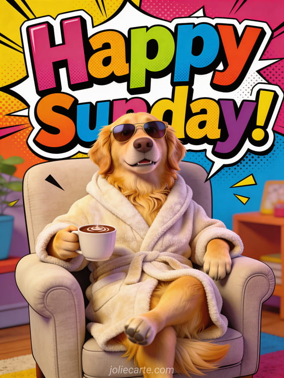 Make someone smile with this funny happy Sunday greeting featuring a golden retriever in a fluffy bathrobe and sunglasses. Discover also a free animated happy sunday virtual card, happy sunday kisses humor or have a happy sunday.