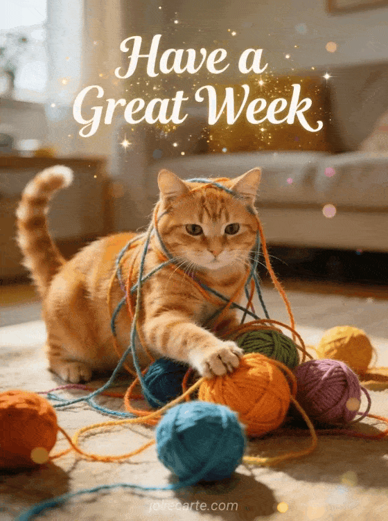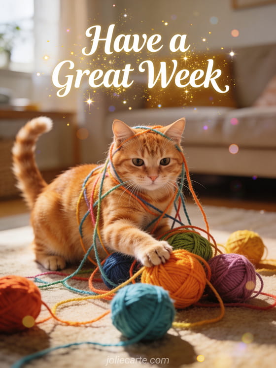 Funny have a great week image a funny have a great week image with a playful orange cat tangled in yarn