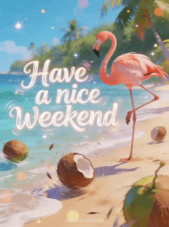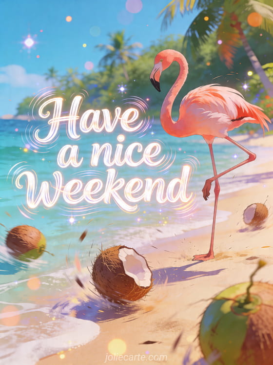 Make someone smile with this hilarious weekend card showing a clumsy flamingo trying a ballet pose on one leg on a tropical beach with coconuts rolling around. You can also discover i wish you a nice weekend, good weekend everyone or funny have a nice weekend.