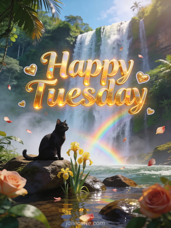 Surprise someone with this spectacular Tuesday card showing Iguazu Falls and an elegant black cat. Discover also a happy tuesday good day images or a great tuesday kisses.