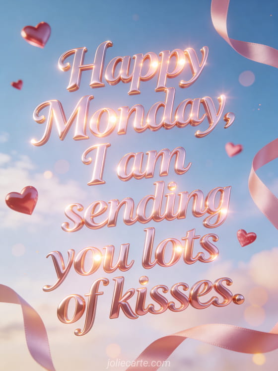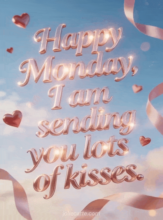Share Monday kisses with glossy romantic lettering, floating hearts and satin ribbons in a bright sky with soft bokeh. You can also send happy Monday cards, a free virtual happy Monday card or a happy Monday good week gif.