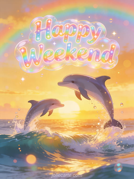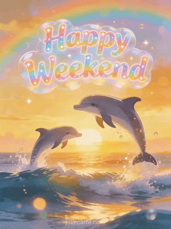 Gifs happy weekend a joyful weekend greeting with animated dolphins and rainbow sparkles