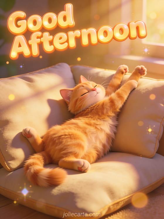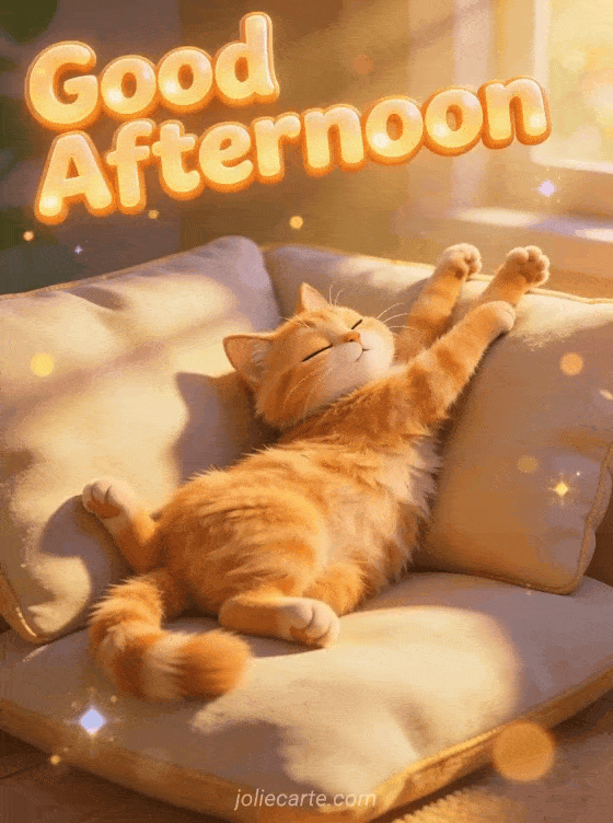 Send a cute good afternoon cat gif to brighten someone's afternoon with a warm and cozy greeting. Discover also a good afternoon card, a good afternoon funny card or a sunny afternoon card.