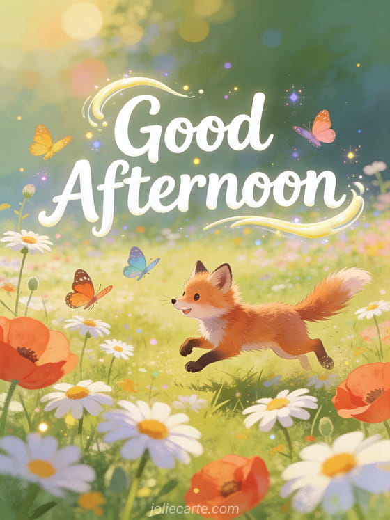 A joyful and whimsical good afternoon card with a playful fox cub chasing butterflies in a wildflower meadow full of daisies and poppies. Discover also a funny good afternoon gif, a good afternoon kitten image or a enjoy your meal have a nice afternoon.