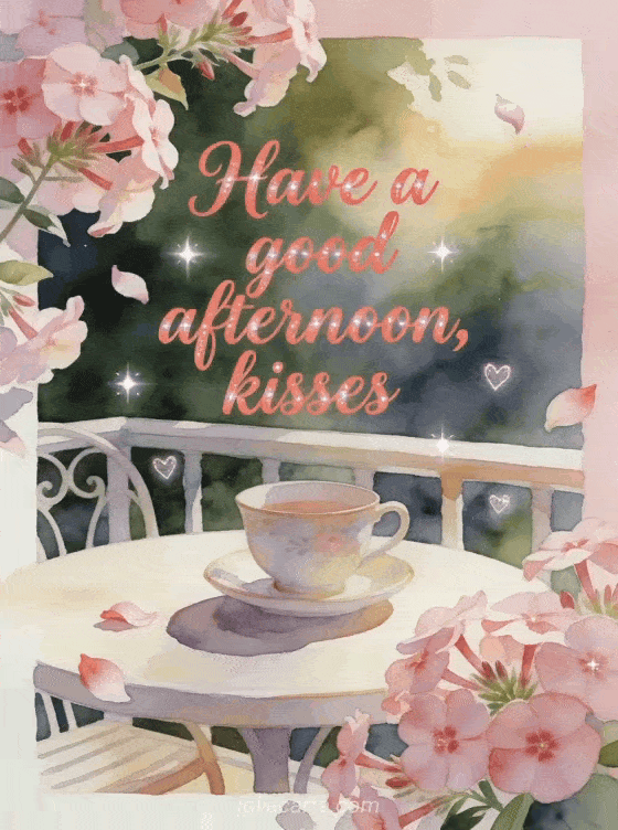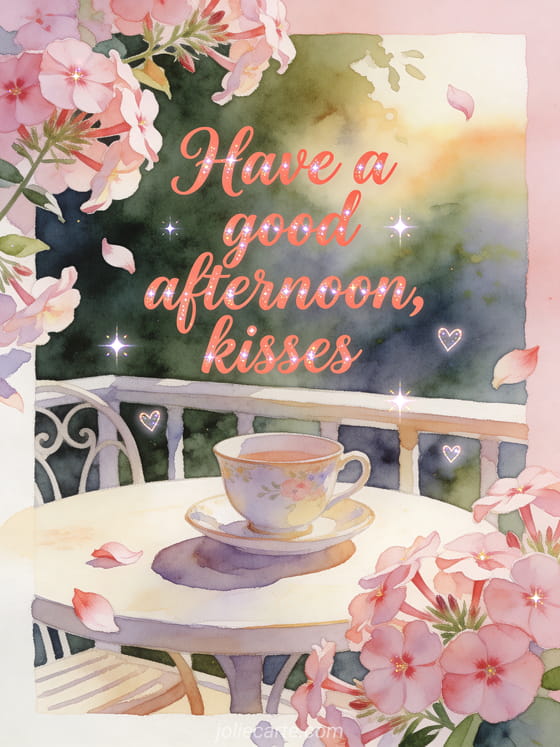 Brighten the afternoon with a soft watercolor card featuring coral lettering, phlox petals and a cozy terrace teacup. You can also send afternoon kisses, a beautiful afternoon kisses image or good afternoon animated images.