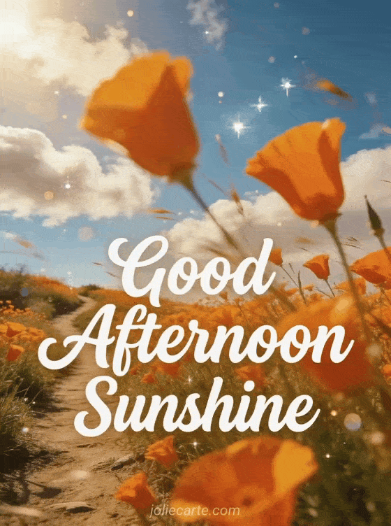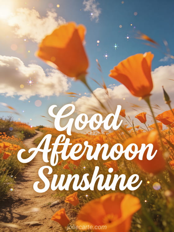 Share warmth with this good afternoon sunshine card featuring a vibrant field of orange California poppies on a sunny afternoon. Discover also a very beautiful good afternoon images or a good afternoon humor image card.