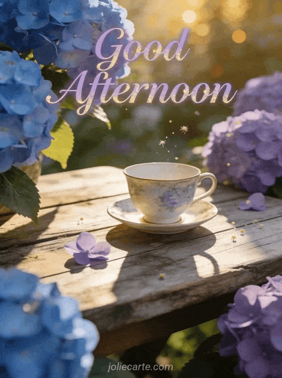 Share a sweet good afternoon Wednesday wish with this dreamy card featuring blooming hydrangeas and a vintage teacup. Discover also wednesday good morning gifs or nice day happy wednesday for more Wednesday inspiration.