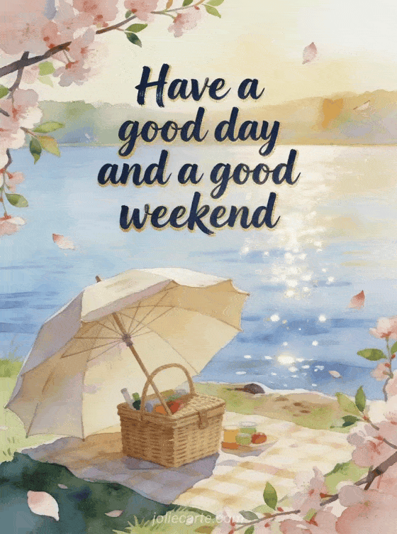 Share a relaxed good day and weekend greeting with a lakeside picnic, canvas parasol, wicker hamper, and cherry blossom branches in watercolor. Discover also good morning have a lovely day kisses gif, good day nature gif, or good morning and have a good day gifs.