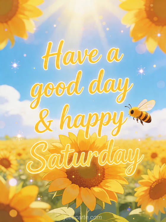 Send a joyful Saturday message with this radiant card showing a sunflower field under a blue sky with a bee hovering nearby. You can also discover free happy saturday kisses image, happy saturday positive quote or happy saturday animated sparkling gif.