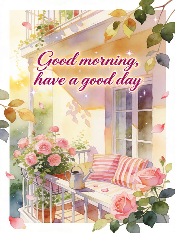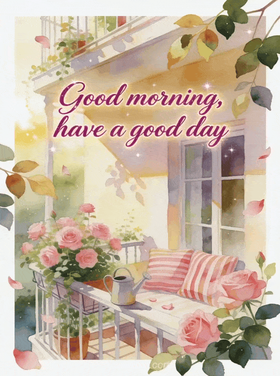 Share a bright good morning and good day card with pink roses, a small watering can, striped cushions and warm sunlight on a balcony garden. Discover also animated good morning have a good day image, good morning good day kisses images or have a good day animated gif good morning have a good day.