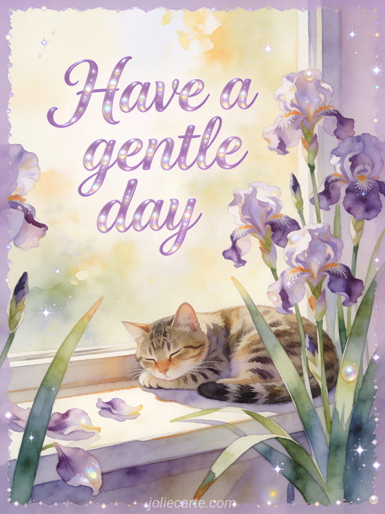 Share a gentle good day message with a tabby cat resting beside iris flowers on a sunlit windowsill in watercolor. Discover also good day gifs, good rainy day gif, or good rainy day.