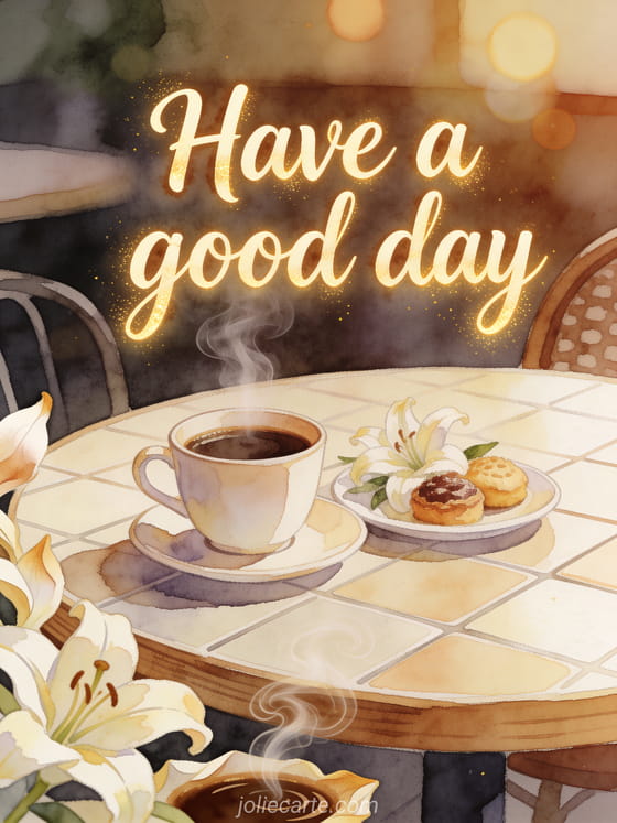 Share a cozy good day message with a steaming coffee cup, pastries and daylily flowers on a cafe table. Discover also a good day cat gif, good day gifs or a good rainy day gif.