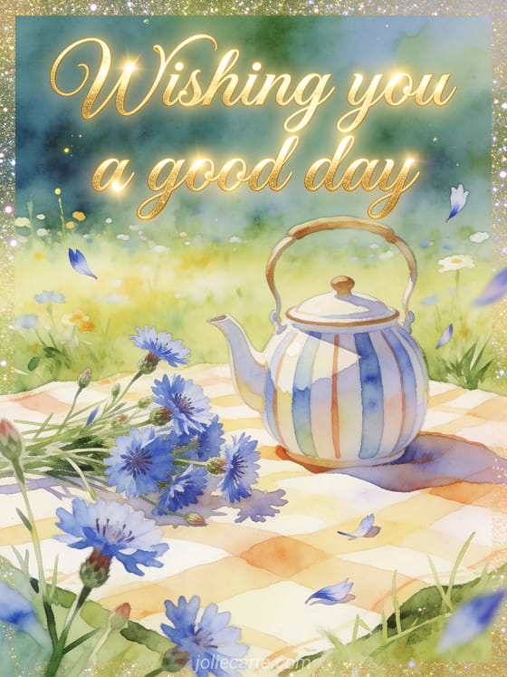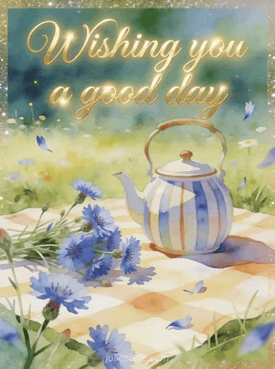 Share good day gifs with graceful golden lettering, a meadow picnic still life, cornflower blooms and a striped teapot in bright morning light. You can also send a good rainy day gif, a good rainy day card or kisses gif nice day kisses I love you.
