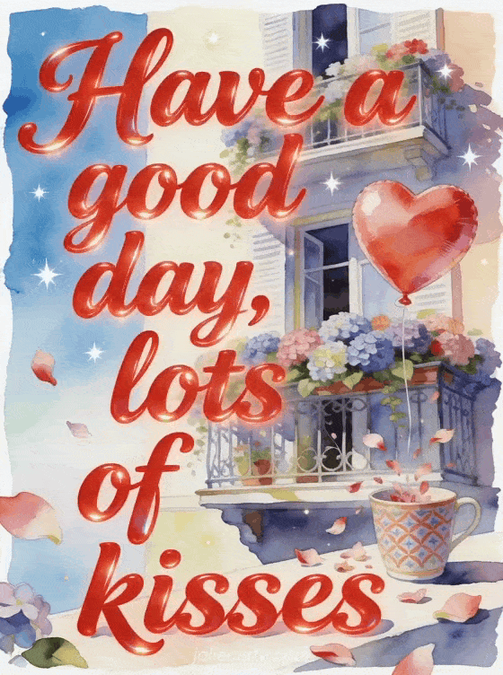 Send have a good day, lots of kisses with bright crimson calligraphy, hydrangea blooms on a balcony, a heart balloon and a patterned cup. Discover also coffee good day coffee gif, lovely day kitten gif or good day good morning beach image.