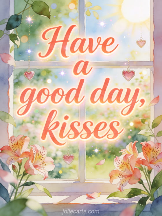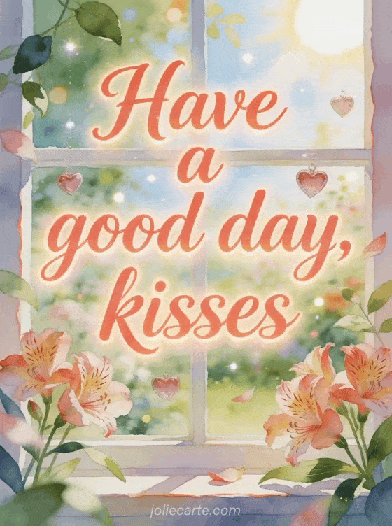 Share have a good day and kisses in a bright watercolor garden window with alstroemeria blossoms, floating heart charms and sunlit leaves. Discover also good morning good day animated gif animated gif, good day too gif or good day fairy gif.