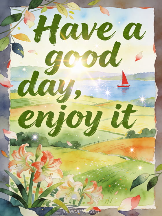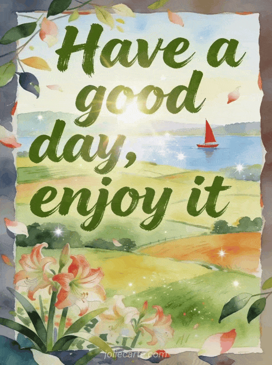 Send a good day landscape gif with moss green lettering, a rolling countryside landscape, amaryllis blooms in the foreground and a red sailboat on a distant lake. Discover also this have a good day good morning have a good day gif, this good morning gif good morning good day or this good day rain gif.