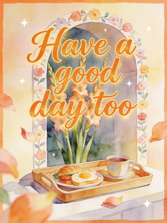 Send a warm have a good day too greeting with a cheerful breakfast tray, a steaming cup and gladiolus flowers in a cozy alcove. Discover also good day fairy gif, good day kisses animated gif or coffee good day coffee gif.