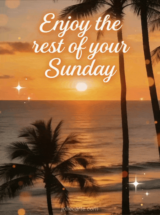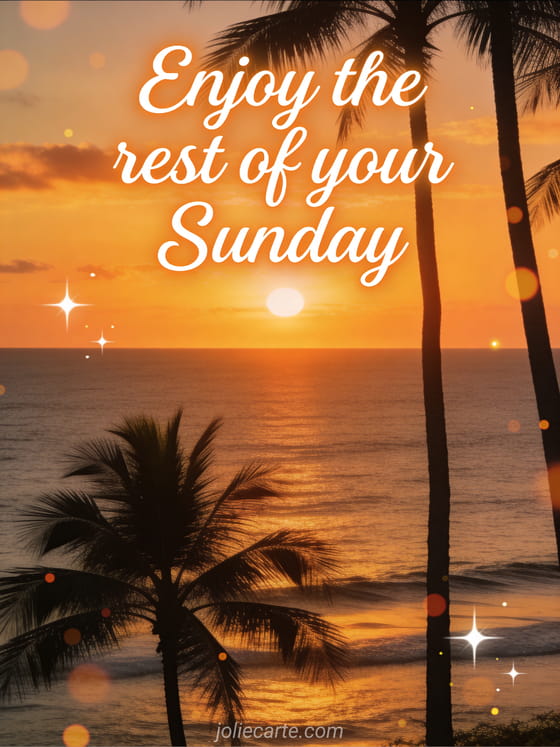 Share a peaceful Sunday evening greeting with a gorgeous sunset over the ocean, silhouettes of palm trees, and warm golden-hour light. Discover also good day Sunday or a happy Sunday card.
