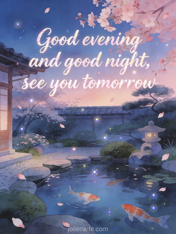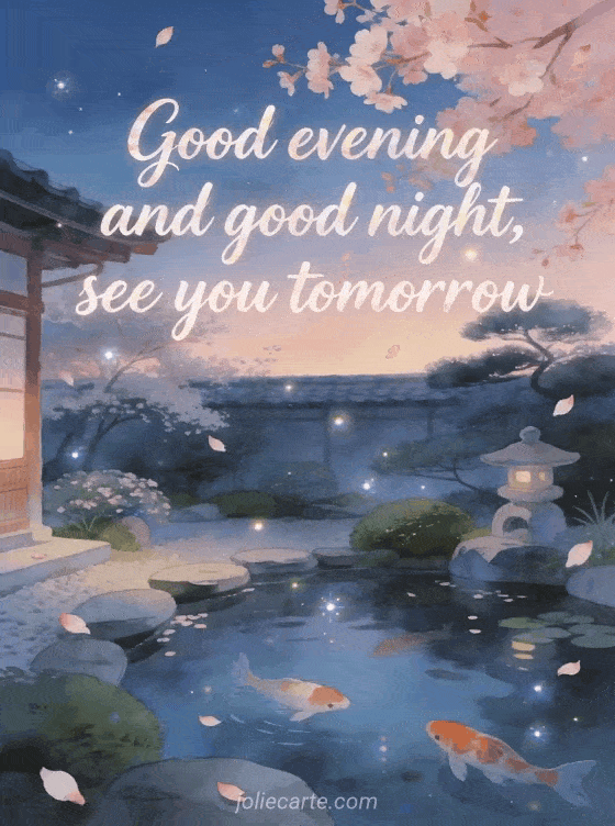 Share a calm and tender evening greeting with this zen card set in a Japanese garden at twilight with koi fish and falling cherry blossoms. You can also discover good evening good night kisses see you tomorrow, landscape good evening see you tomorrow or lovely evening see you tomorrow.