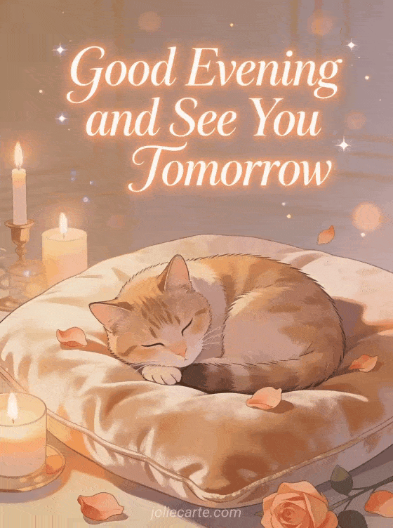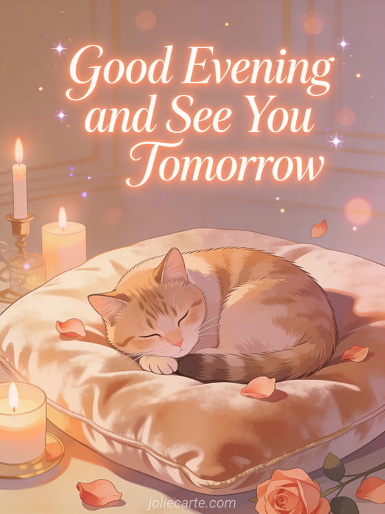 Share a beautiful good evening and see you tomorrow image with a serene sleeping cat curled up on a velvet cushion surrounded by candlelight and scattered rose petals. Discover also a good night see you tomorrow funny card, a good evening see you tomorrow funny card or a good evening see you tomorrow image.