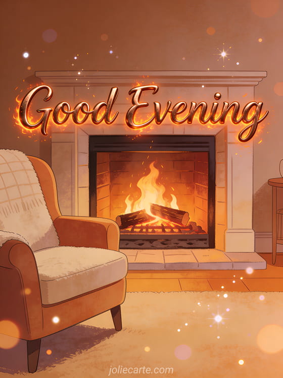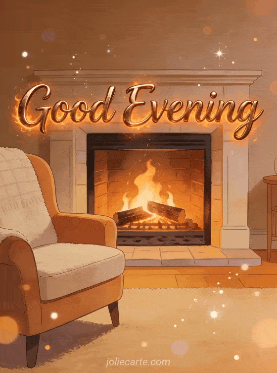 Send a warm good evening by the fireplace with this cozy free card. A crackling fireplace with dancing flames and a cozy armchair, for an intimate and warm evening greeting. Discover also a good evening gif image card or a good evening black cat card.