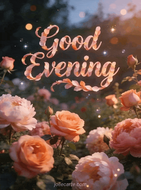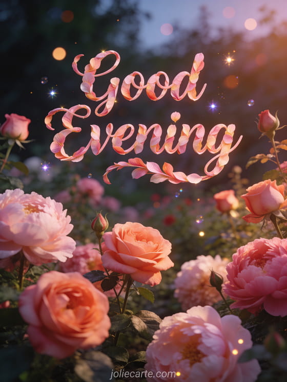 Share this beautiful floral good evening card featuring a lush garden of blooming roses and peonies bathed in warm evening light with romantic pink and coral tones. A lovely card perfect for wishing someone a peaceful evening. Discover also a good evening and night kisses card or a good evening kitten image card.