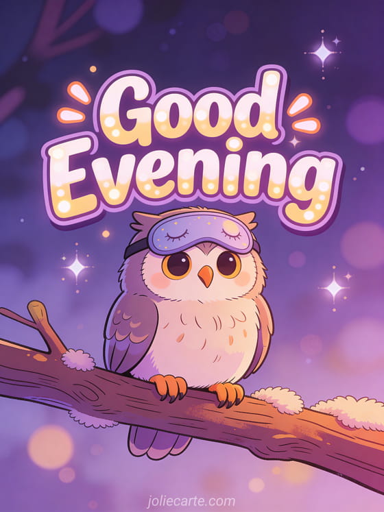 Send a hilarious good evening card with a funny owl in a sleep mask with this free greeting card. Discover also a good evening image with kisses or a good evening by the fireplace card.