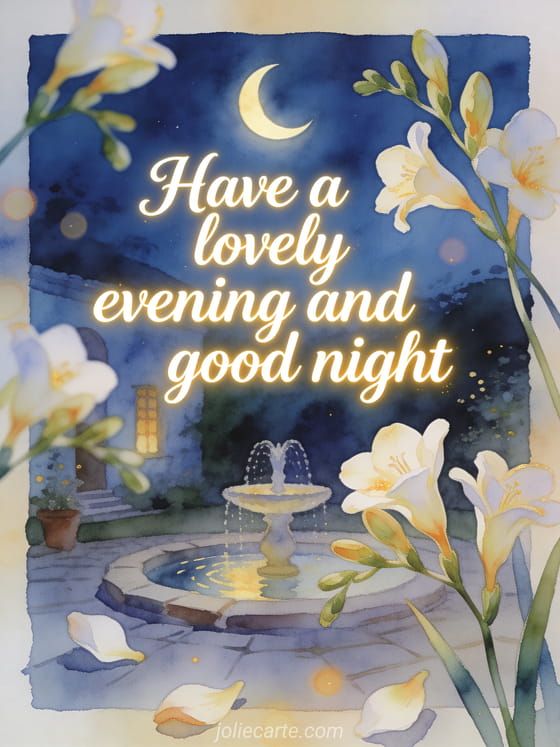 Send a lovely evening and good night with a watercolor card showing a crescent moon, a small courtyard fountain, freesia flowers, and tranquil evening blue. Discover also a good night e-card, a good evening good night virtual card or a lovely good night message.