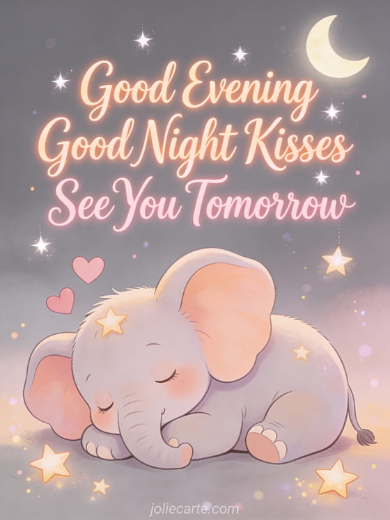 Good evening good night kisses see you tomorrow an adorable sleepy elephant to wish good evening good night kisses see you tomorrow