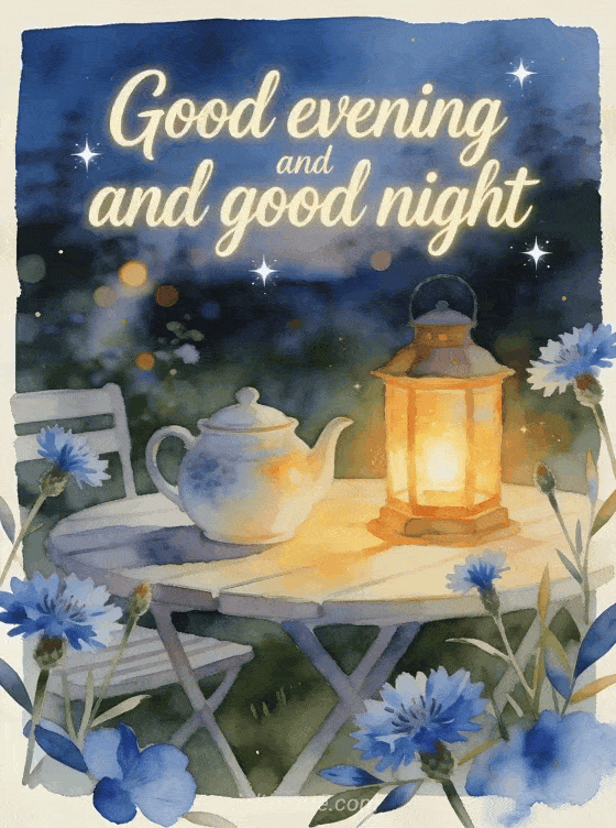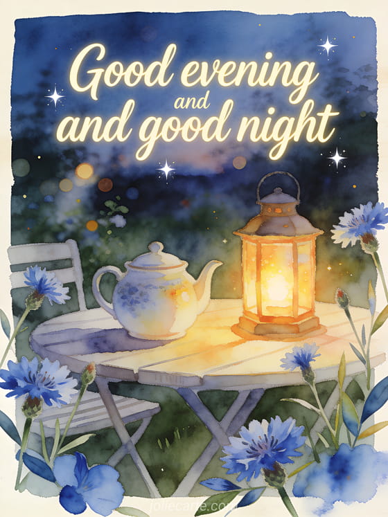 Share a good evening good night virtual card with warm ivory lettering, a twilight garden table, a porcelain teapot, glowing lantern light and cornflowers. You can also send a lovely good night message, a good night message for him or a message to wish good night.