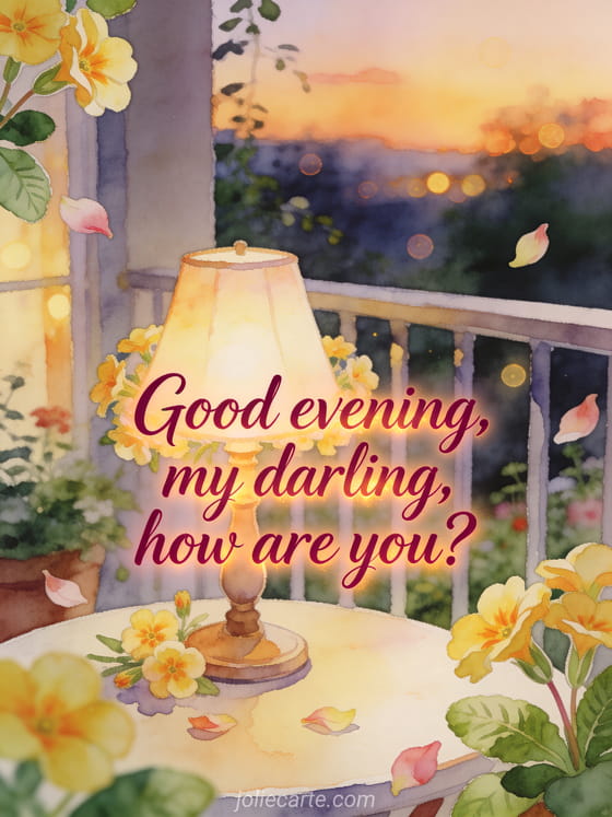 Send a caring evening message with deep rose script, primrose flowers, a warm table lamp, and a cozy balcony garden at twilight. Discover also a hello how are you today, an are you okay my love card, or a how are you my love sms greeting.