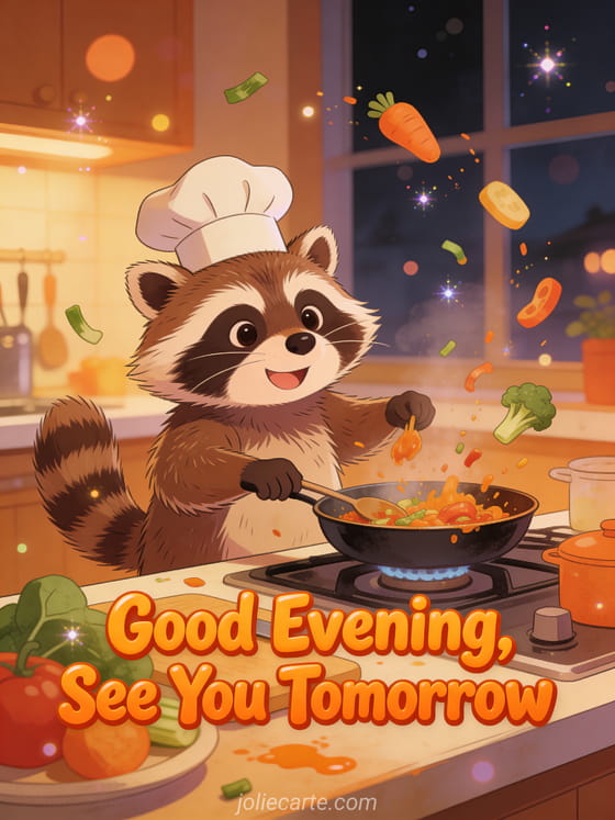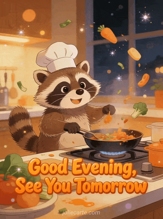 Make someone smile with this silly raccoon chef good evening card. Discover also a good evening see you tomorrow image card or a good night see you tomorrow kisses gif card or a good evening good night see you tomorrow card.