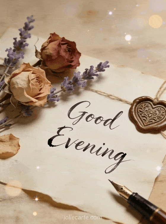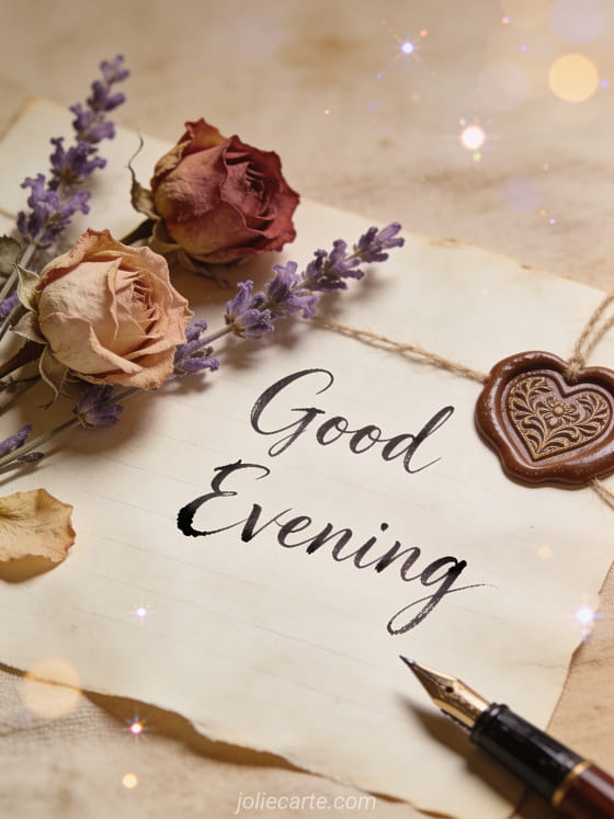 Send a beautiful good evening text message with this free card featuring an elegant handwritten letter with dried flowers. Discover also a good evening kisses or a good evening image jpg.