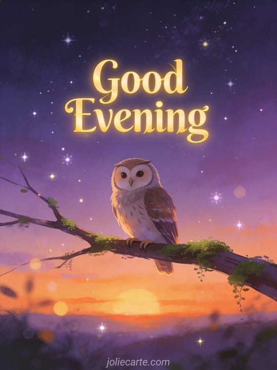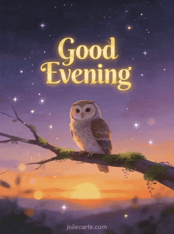 Wish someone a beautiful Friday evening with this peaceful card featuring a wise owl perched under a starlit twilight sky. See also happy friday funny gif or good morning have a great friday.
