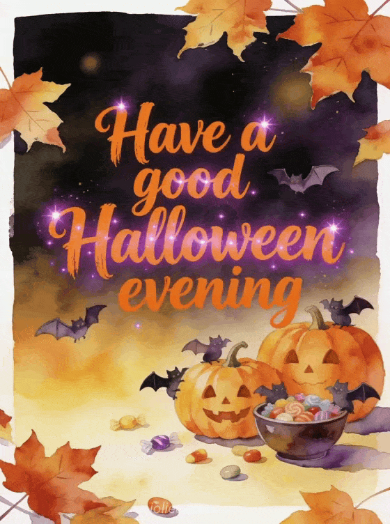 Share have a good Halloween evening with pumpkin-orange lettering, cheerful pumpkins, small watercolor bats around a candy bowl and maple leaves crossing the border. Discover also good evening images search, a good evening cat image or evening kisses gif.