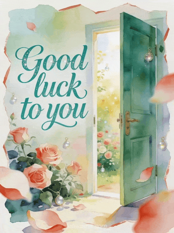 Send a good luck to you message with elegant jade lettering, a lucky green door opening to a radiant garden, roses and small shining charms. Discover also a good luck with your exam text, free animated good luck gifs or a message to wish good luck for an exam.