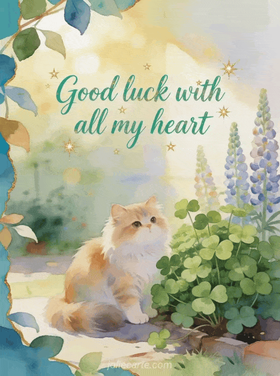 Send a tender good luck card with a fluffy Persian cat beside lucky clovers in a bright garden corner, framed by lupines and leaves. Discover also a free animated good luck gif, a good luck competition image or a good luck with your exams gif.