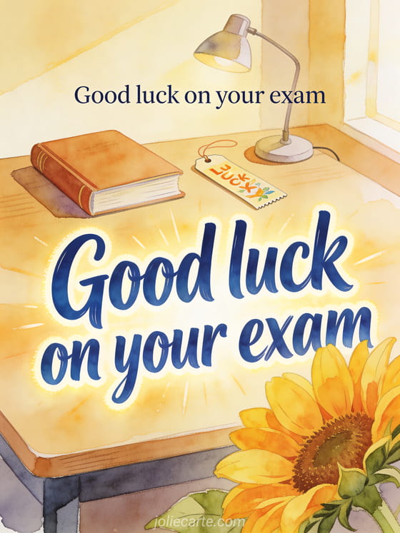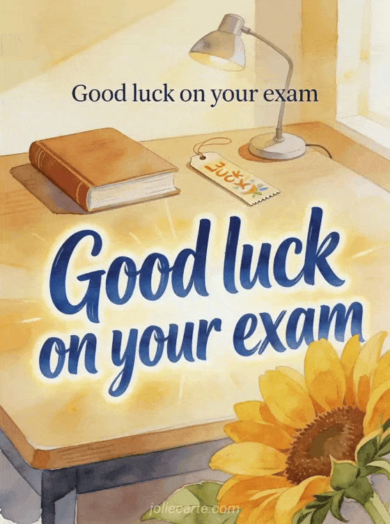 Send good luck exam animated gifs gif with cobalt lettering, a study desk, a closed book, a lucky bookmark, a small lamp and a sunflower. Discover also a good luck new job card, an image to say good luck or a text to wish good luck for an exam.