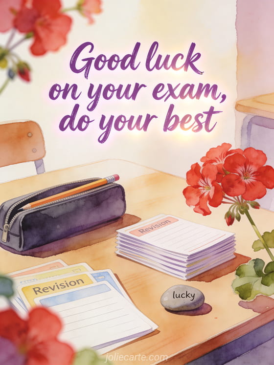 Wish good luck on an exam with a bright watercolor desk, a closed pencil case, revision cards, a lucky pebble and red geranium blossoms. Discover also good luck finding better colleagues than us card, good luck gifs or goodbye and good luck card.