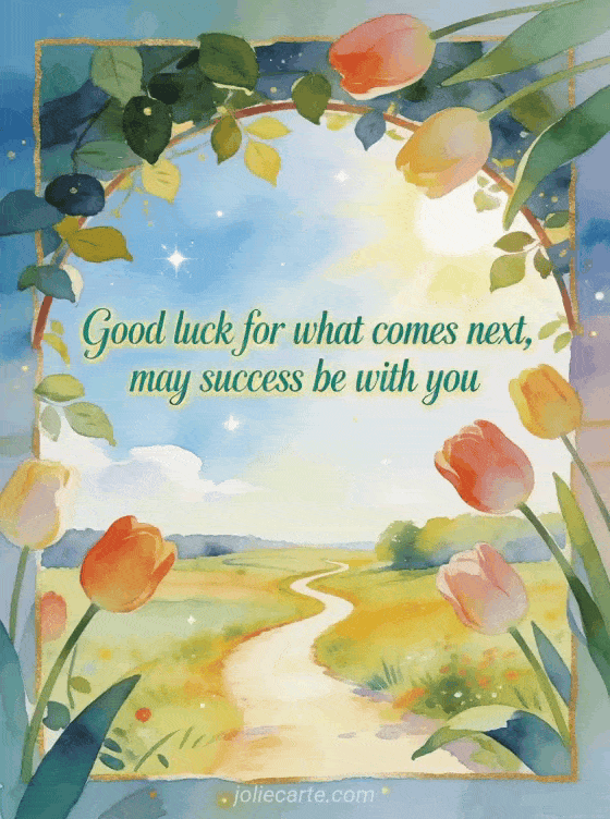 Share an encouraging good luck card with a sunlit countryside path, an arch of leaves, tulips and a radiant sky for the road ahead. Discover also and above all good luck gif, good luck images or and then above all good luck gif.