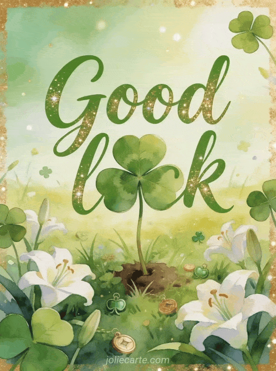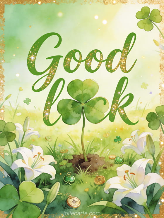 Send a radiant good luck wish with this watercolor card, featuring a four-leaf clover growing in a sunny meadow among lilies and tiny lucky charms. Discover also virtual good luck cards, good luck exam animated gifs gif, or good luck new job card.