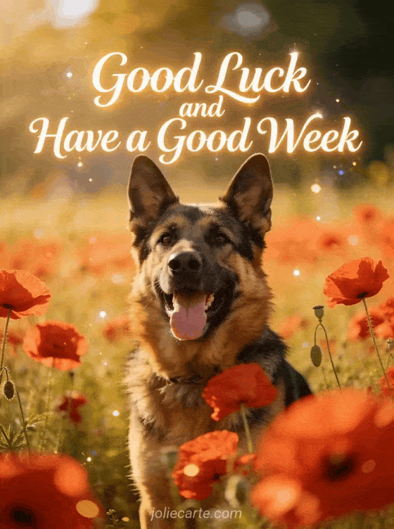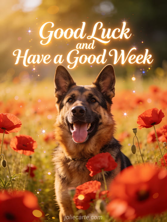 Share some joy with this good luck and good week card featuring a happy German shepherd in a field of red poppies. Discover also a good morning and good week images or a funny animated good week card.