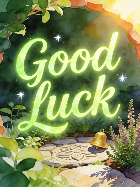 Share a bright good luck card with a carved garden path, a small golden bell, heather sprigs and warm sunlight. Discover also and then above all good luck gif, a good luck animated picture or good luck everyone image.