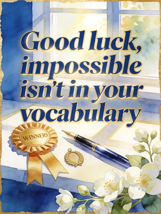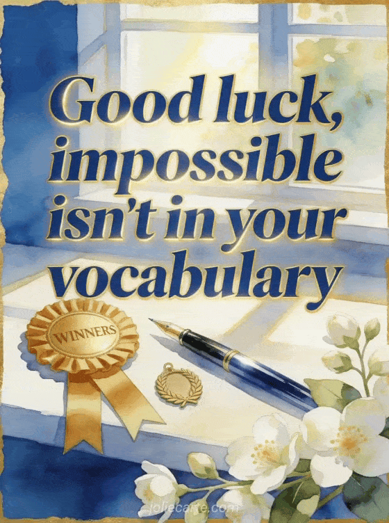Send a confident good luck card with a winner ribbon, polished pen, laurel charm and jasmine flowers under bright window light. Discover also a good luck image with a horse, a good luck encouragement gif or a free good luck card.