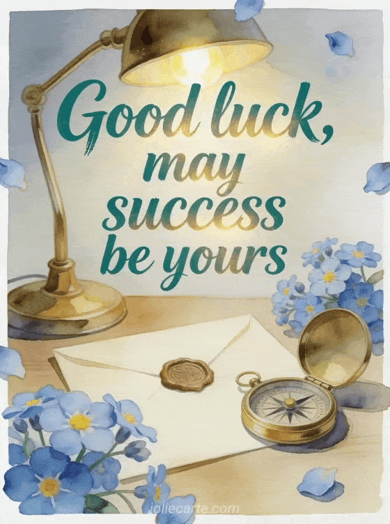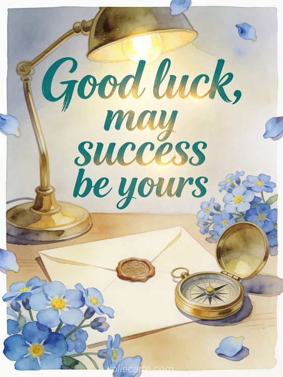 Send an encouraging good luck message with an elegant desk, a brass lamp, a sealed envelope, a compass and forget-me-not blossoms. Discover also good luck animated gif, good luck gif image or good luck exam message.