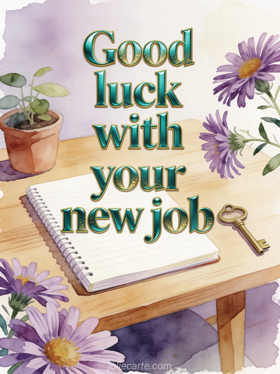 Share good luck for a new job with a neat oak desk, a fresh notebook, a small plant, a brass key and purple aster flowers. Discover also an image to say good luck, a text to wish good luck for an exam or animated good luck gifs.