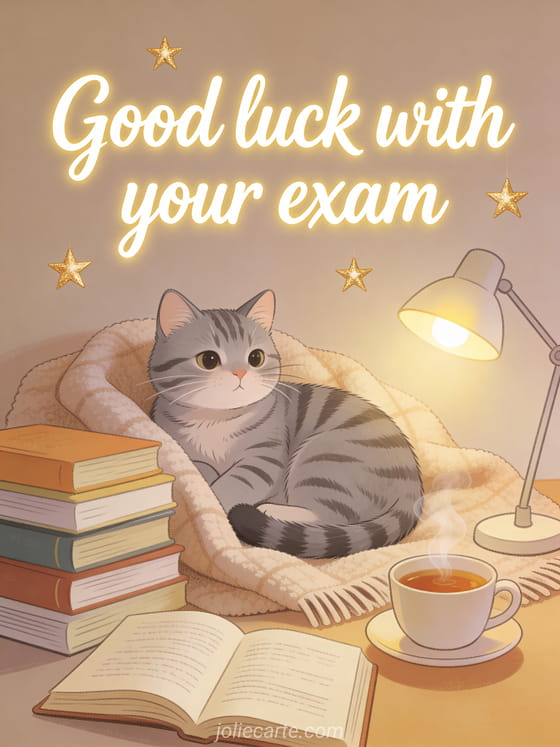 Brighten up exam prep with this adorable card featuring a tabby cat snuggled on a plaid next to a pile of books and a steaming cup of tea. Discover also a good luck exam animated card.