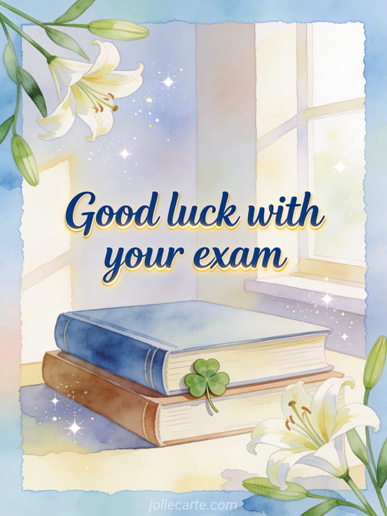 Encourage someone before an exam with royal blue script, a golden underline glow, a neat stack of books, a lucky clover bookmark, daylilies, and green stems crossing the border. You can also share a good luck exam card, a new job good luck text, or a good luck message.